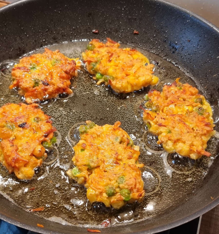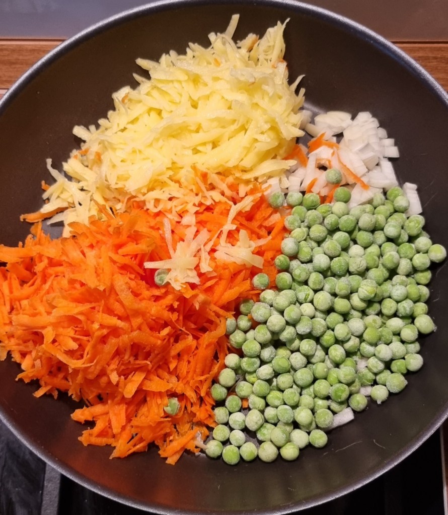 - Das Gemüse grob raspeln und mit den Erbsen und klein geschnittene Zwiebel in einer Pfanne anbraten. Es soll aber nicht zu weich gebraten werden.