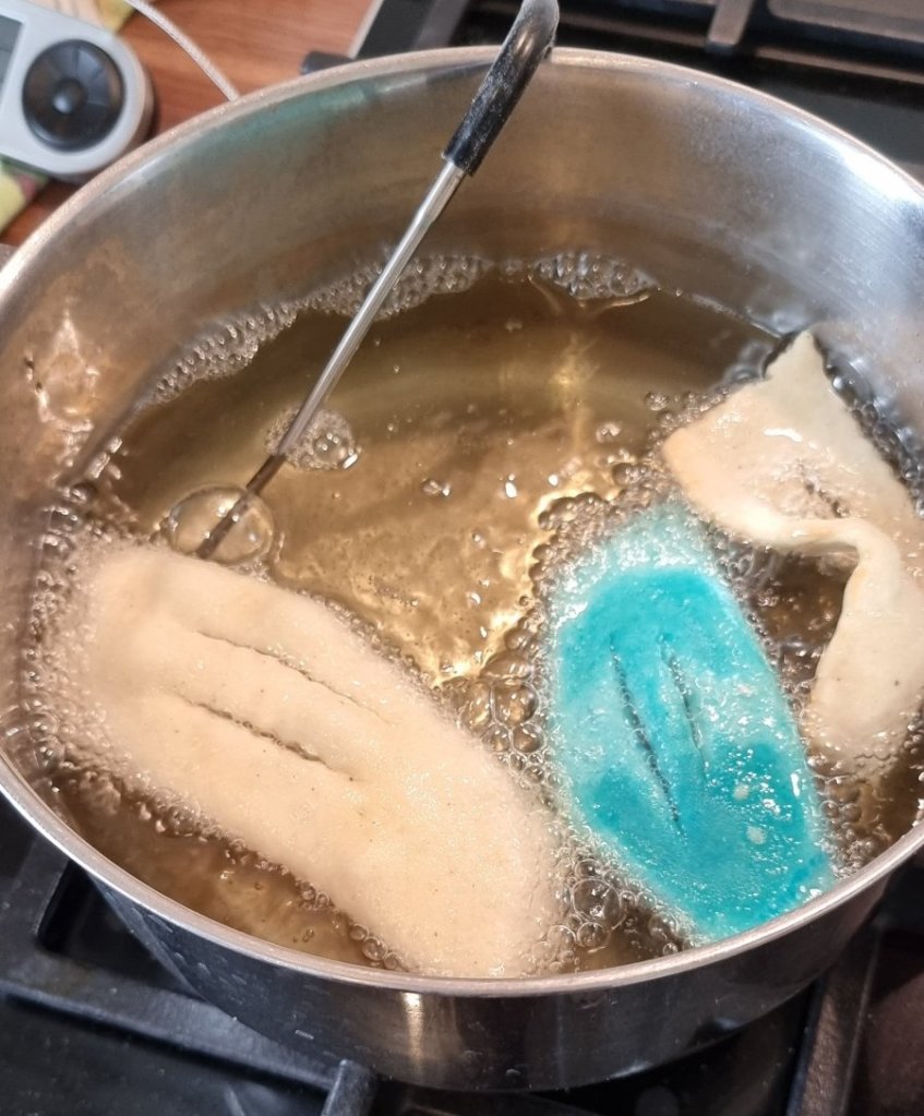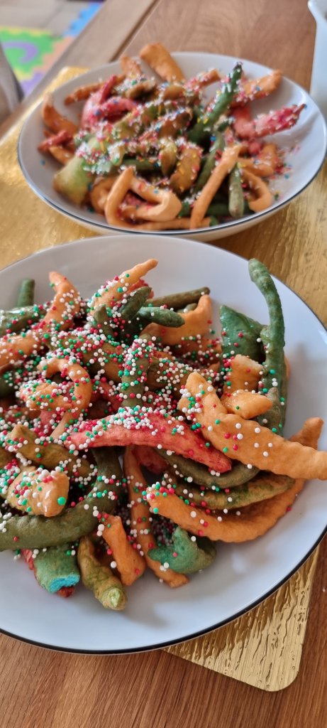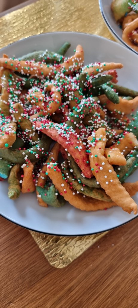 Die Chiacchiere werden typischerweise einfach nur mit Puderzucker bestreut, in unsere Familie machen wir aber zwei verschiedene Versionen. Die eine wie gesagt klassisch und die andere werden wie kleine Luftschlangen geschnitten, frittiert, mit Honig beträufelt und mit Zuckerstreuseln verziert. Eine Besonderheit gibt es bei meine Chiacchiere auch noch … ich mache ein Teil vom Teig bunt … mein Kind liebt es grüne Chiacchiere zu essen 😁😍.