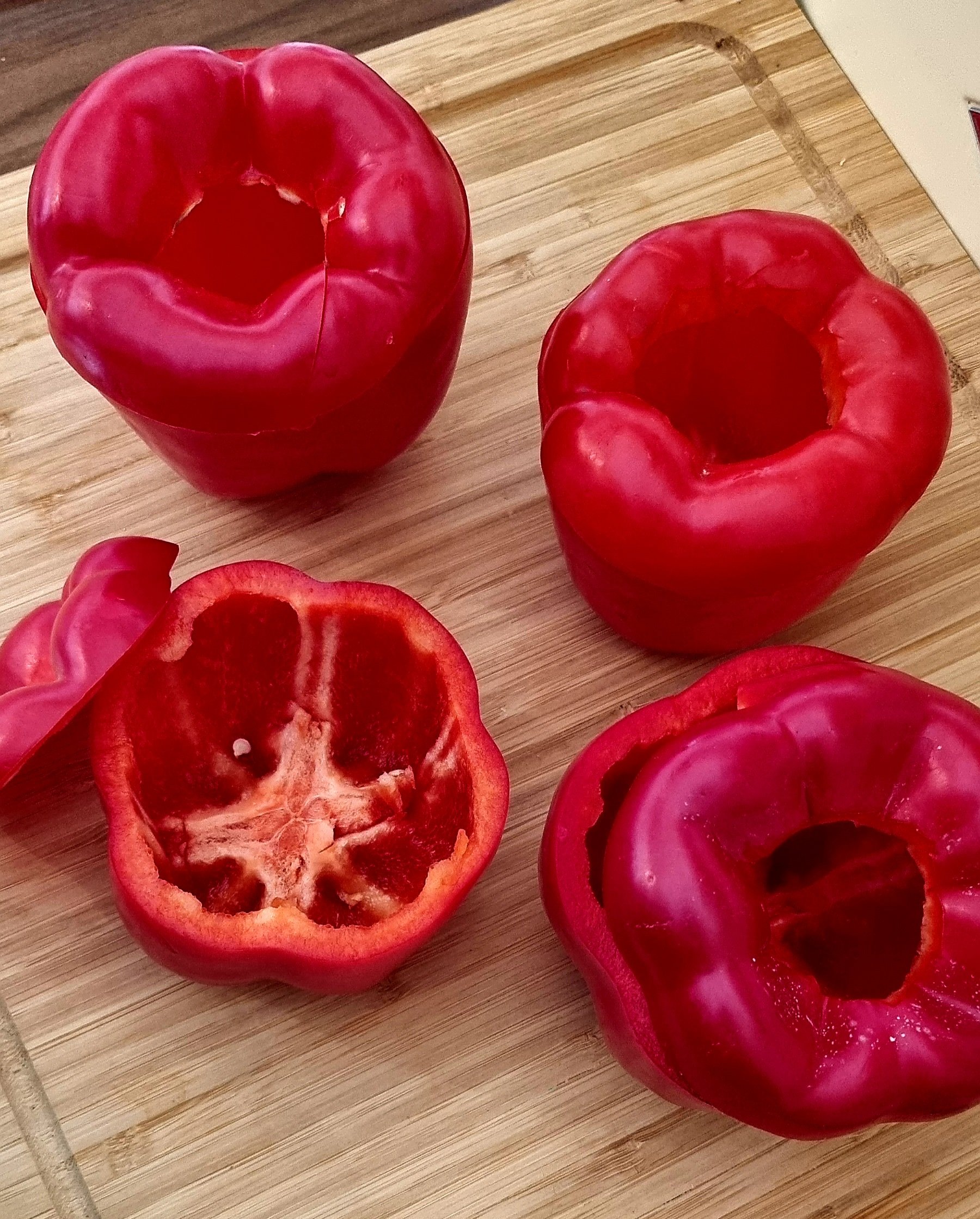 - Nun die Paprika putzen, waschen und mit dem Risotto füllen.