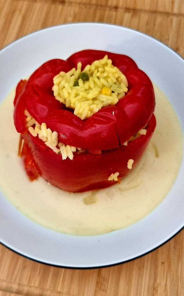 Meine Lieben, heute möchte ich euch mein vegetarisches Rezept für gefüllte Paprika vorstellen. Ich habe sie mit einem köstlichem Gemüserisotto gefüllt und in Gemüsebrühe gegart. Den Sud verwende ich dann, um eine helle Soße zu machen.