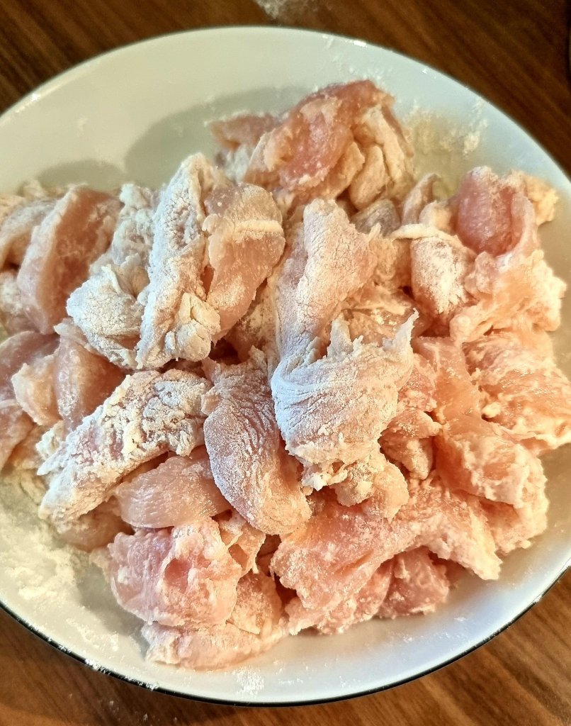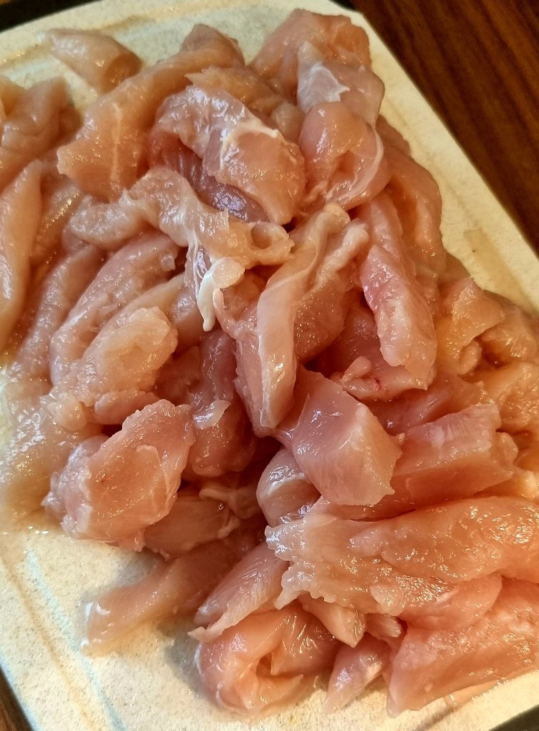- Hähnchen waschen, trockentupfen und in streifen schneiden