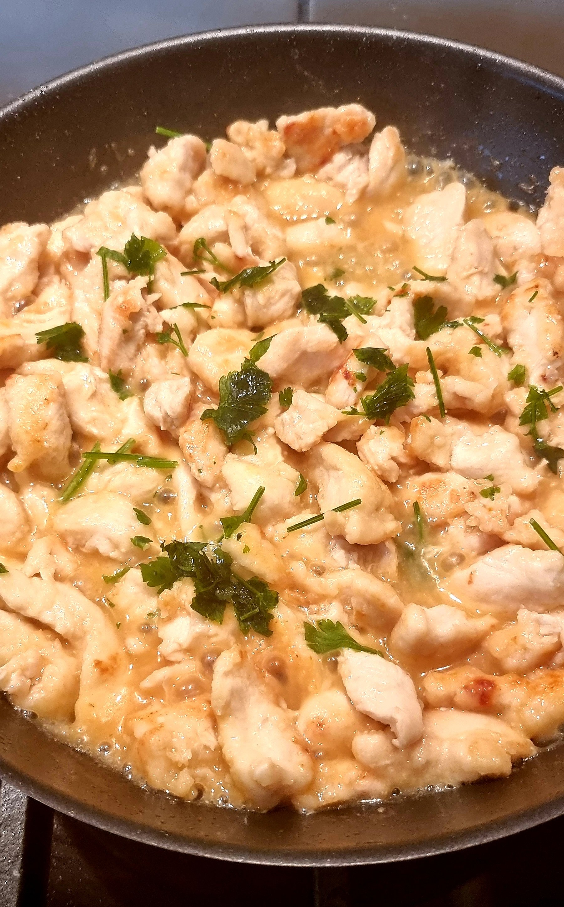 - wenn das Hähnchen schön kross angebraten ist, mit Zitrone und ein Teil Wasser (im Verhältnis zur Zitrone) ablöschen