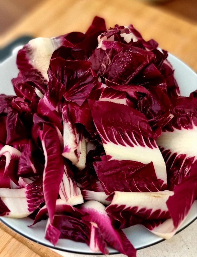 - Den Radicchio putzen – kleinschneiden – den Strunk entfernen – in lauwarmenwasser waschen
