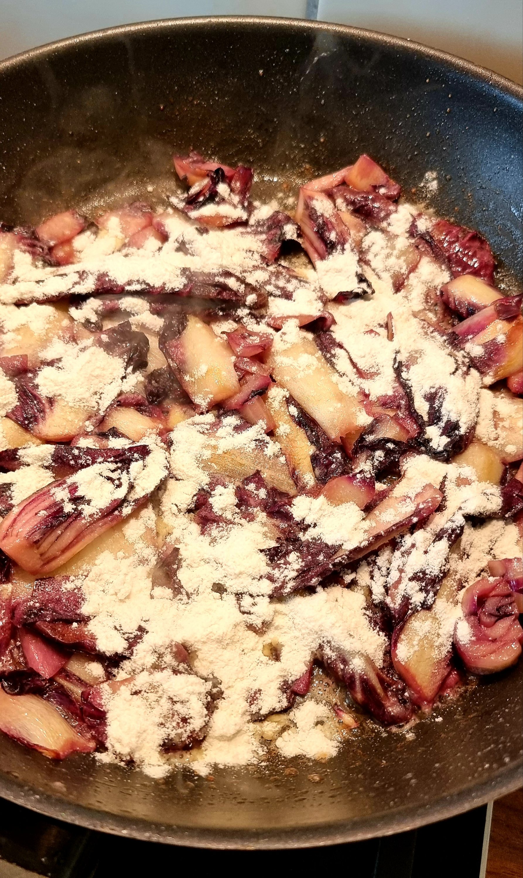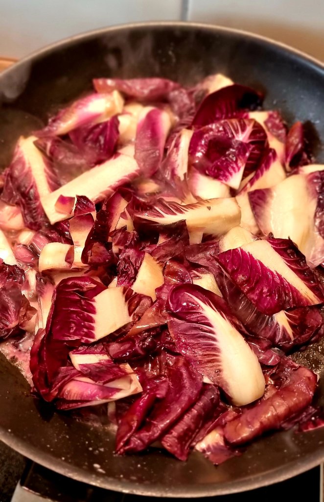 - Die Butter in der Pfanne schmelzen und die Zwiebel und den Radicchio darin anbraten