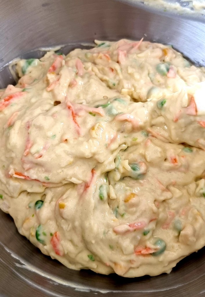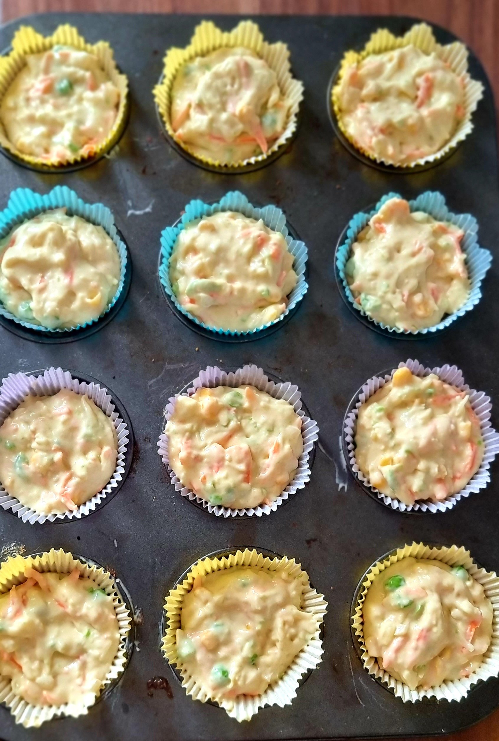 Alles in einer Schüssel geben und miteinander vermengen. Ein Muffinsblech vorbereiten und ca. 2 Esslöffel Teig pro Mulde hineingeben.