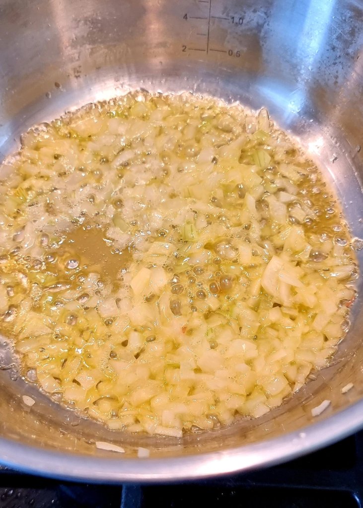- Zwiebel klein schneiden und mit dem Olivenöl in einem Topf glasig braten