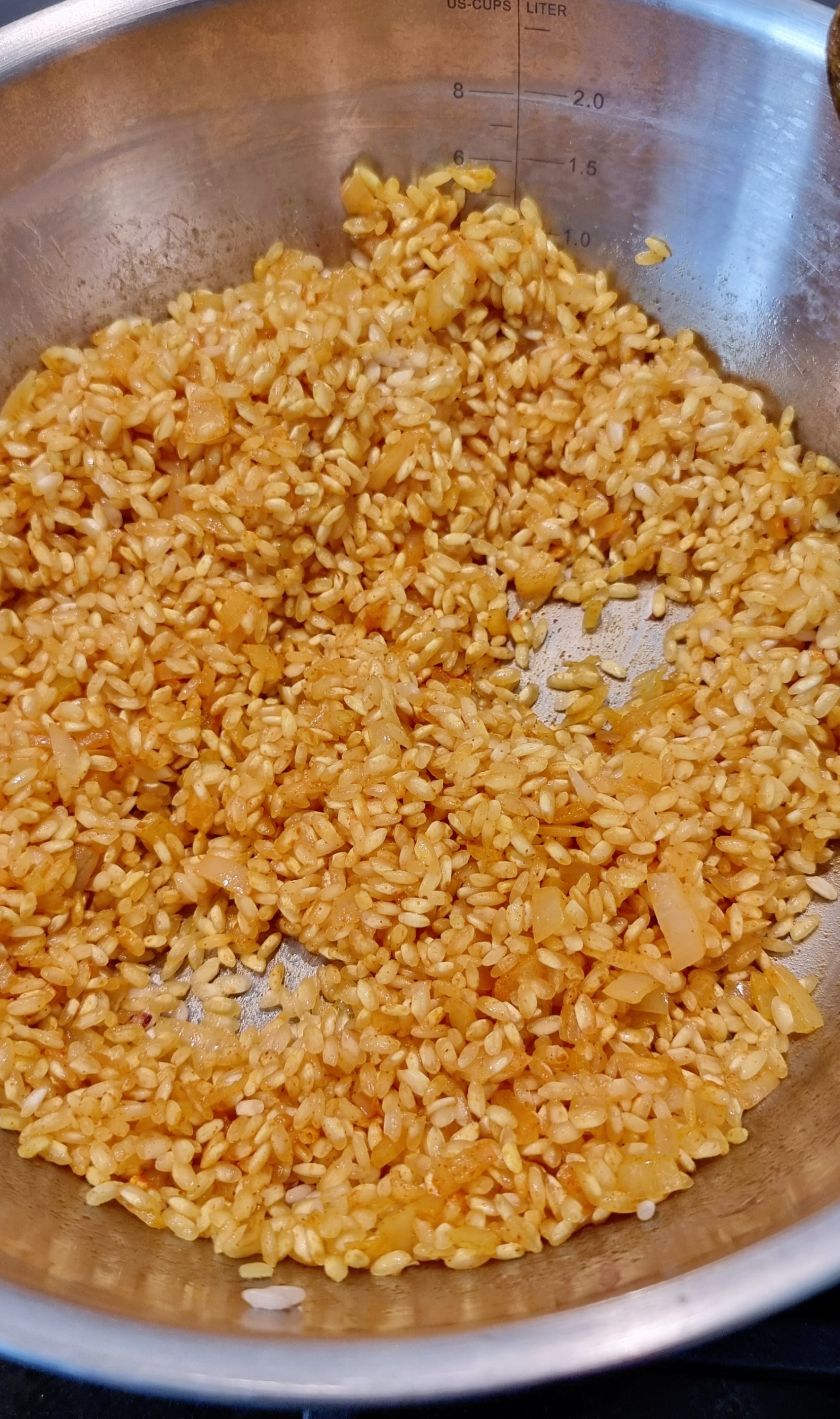 - Den Reis und den Kurkuma hinzugeben und mitanbraten