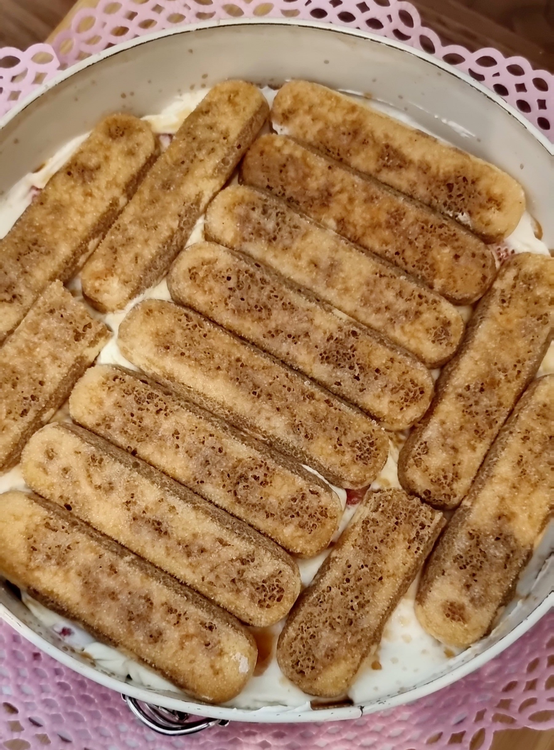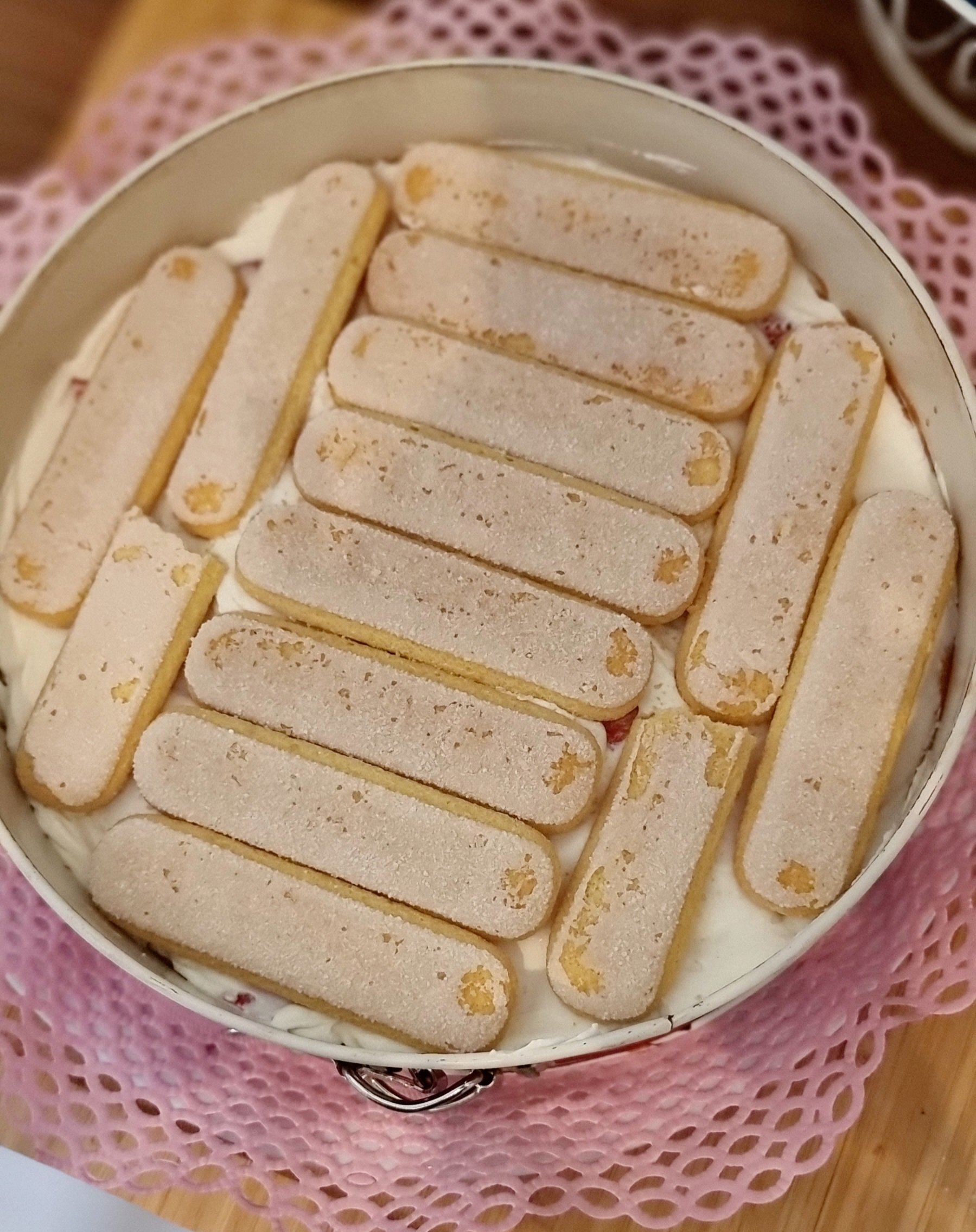 - Löffelbiskuits auf die Creme verteilen/legen