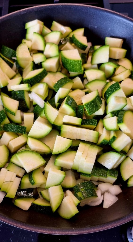 - Währenddessen die Zucchini waschen, die Zwiebel und Zucchini klein schneiden und in einer Pfanne mit etwas Olivenöl anbraten