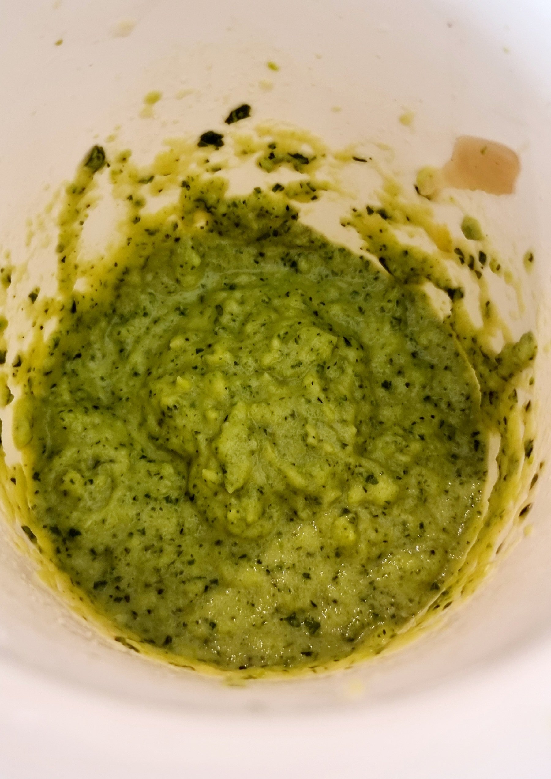 - Nun ein Teil der Zucchini in einem Pürierbecher geben, Basilikum, Parmesan, evtl. Pinienkerne oder Nüsse, Salz, Pfeffer und Olivenöl hinzugeben