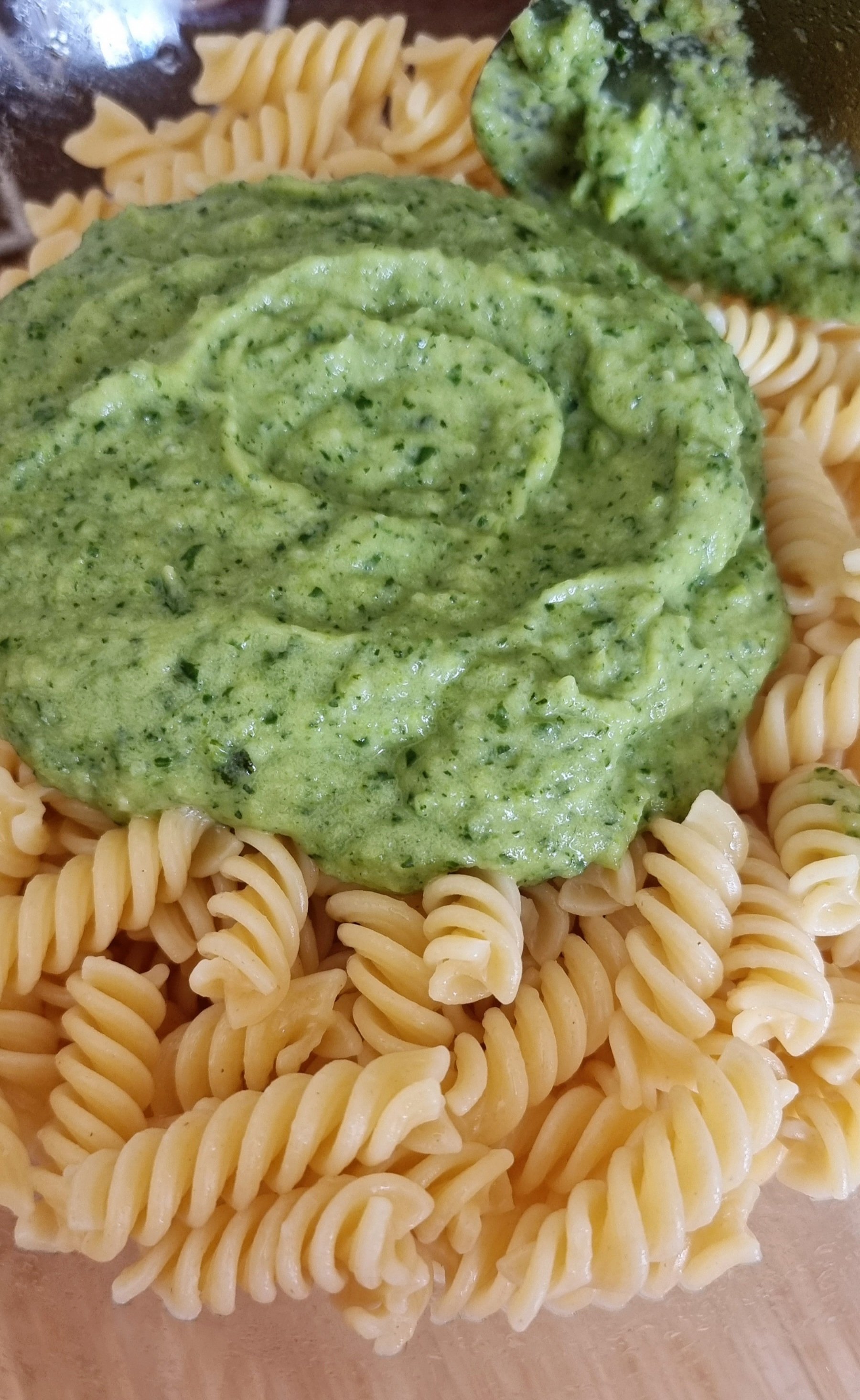 - Den Pesto zu den Nudeln geben und gut miteinander mischen