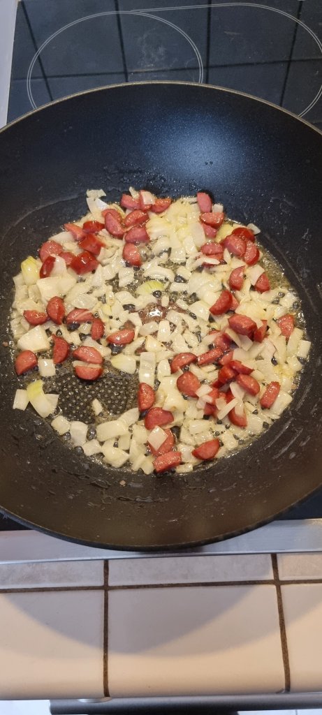 Das Öl und die Butter in die Pfanne geben – darin die Zwiebel und Kabanossi anbraten