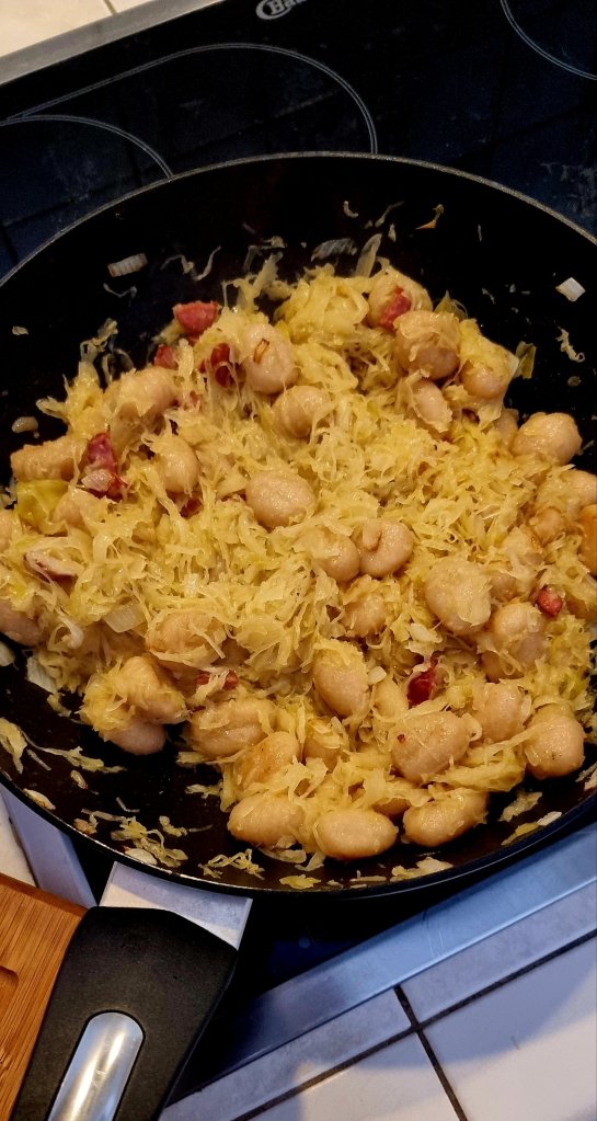 Zum Schluss den Sauerkraut abtropfen und in die Pfanne geben. Mit Salz und Pfeffer abschmecken. Weitere 5 Minuten anbraten und servieren 😍♥️😋