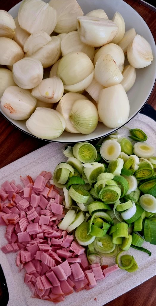 - In der Zwischenzeit die Füllung vorbereiten. Dazu werden Lauch und Zwiebeln geputzt. Den Lauch in streifen schneiden und die Zwiebeln hacke ich in der Küchenmaschine klein ( ihr könnt sie auch mit einem Messer schneiden) genauso wird der Schinken ebenfalls klein geschnitten