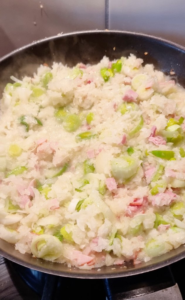 - In einer Pfanne das Öl hineingeben und den Schinken mit den Lauch und Zwiebel anbraten