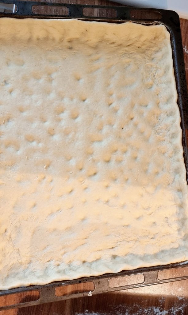 - den Teig auf einer bemehlten Oberfläche ausrollen und in dem Blech legen. Ränder hochziehen