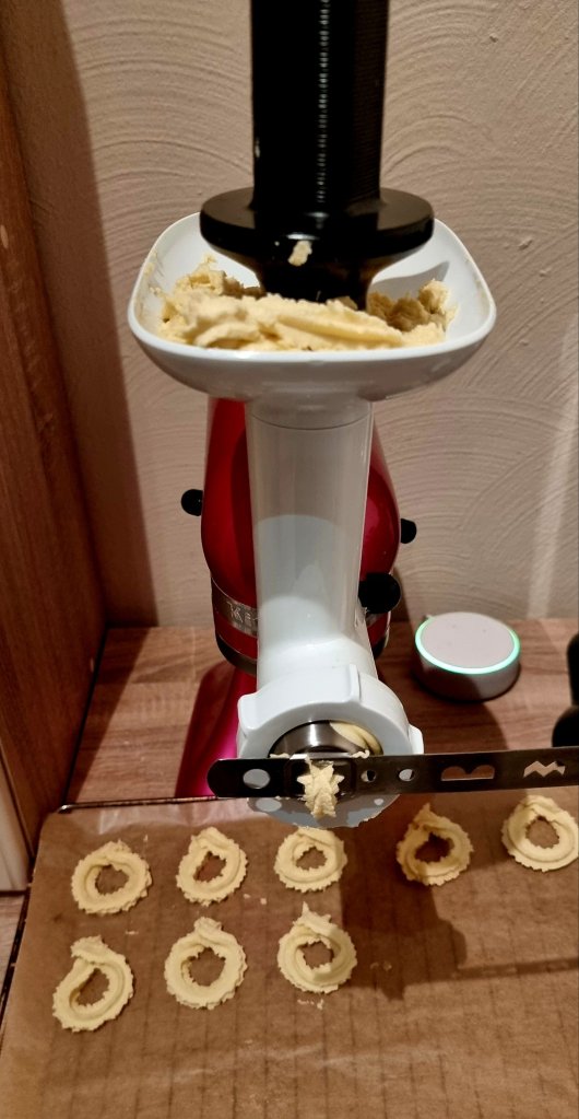 Wir essen unser Spritzgebäck am liebsten nur mit ein bisschen Puderzucker … nur ein kleiner Teil wird mit Schokolade verziert. Jahrelang habe ich mein Spritzgebäck mit dem Fleischwolf per Hand gedreht 😅 kennt ihr den? Ich meine meine Mutter hat ihn irgendwann gekauft wo ich klein war für 10 DM oder so 😂🙈 Naja mittlerweile bin ich auf die Küchenmaschine umgestiegen, was mir viel Arbeit erspart und Zeit. Aber das Spritzgebäck mit dem Fleischwolf per Hand gedreht … hat natürlich am Besten geschmeckt 🥰😂 auf jeden Fall erinnere ich mich gerne zurück.