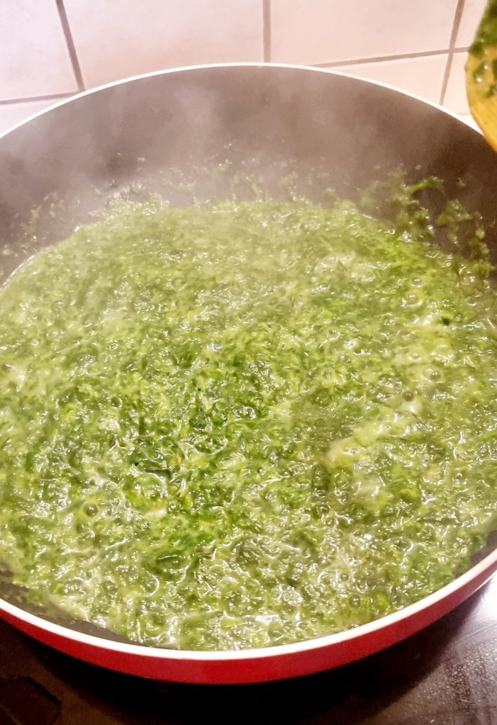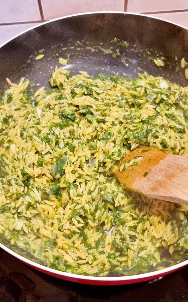 In einer Pfanne oder Topf den Rahmspinat nach Packungsanleitung zubereiten. Ist der Spinat cremig, die Nudeln hinzugeben und mit dem Wasser aufgießen. Umrühren und köcheln lassen. Immer wieder die Kritharaki umrühren, wie beim Risotto und wenn nötig noch etwas Wasser hinzugeben.
