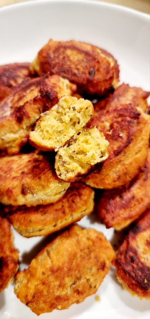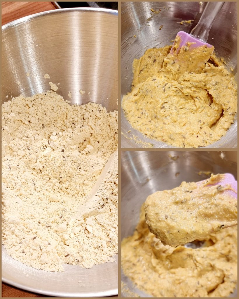 150 g Kichererbsenmehl | 150 ml heißes Wasser | Salz, Pfeffer | 1/2 TL Backpulver | 1 EL Olivenöl | 1 EL Kümmel | 1 EL Zitronensaft | Zitronenabrieb von einer Zitrone | 1 EL Petersilie | 1 Zehe Knoblauch | Öl zum Braten