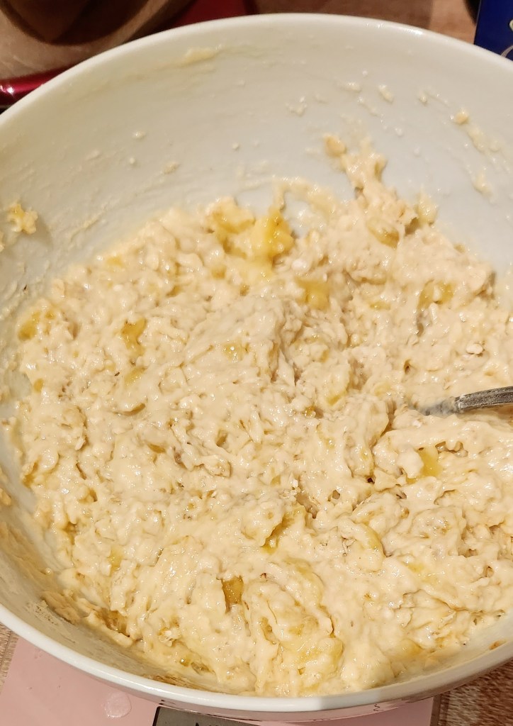 Die Bananen mit der Gabel zu Brei verarbeiten. Die restlichen Zutaten hinzugeben und gründlich miteinander verrühren!