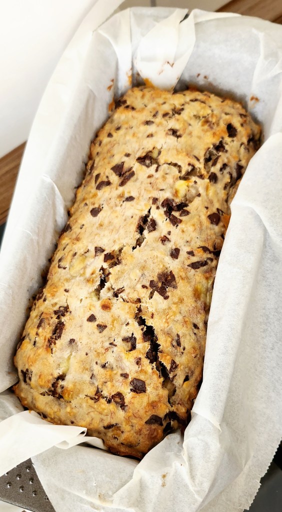 Eine Kastenform mit Backpapier auslegen und den Teig hineingeben. Für 50 Minuten backen.