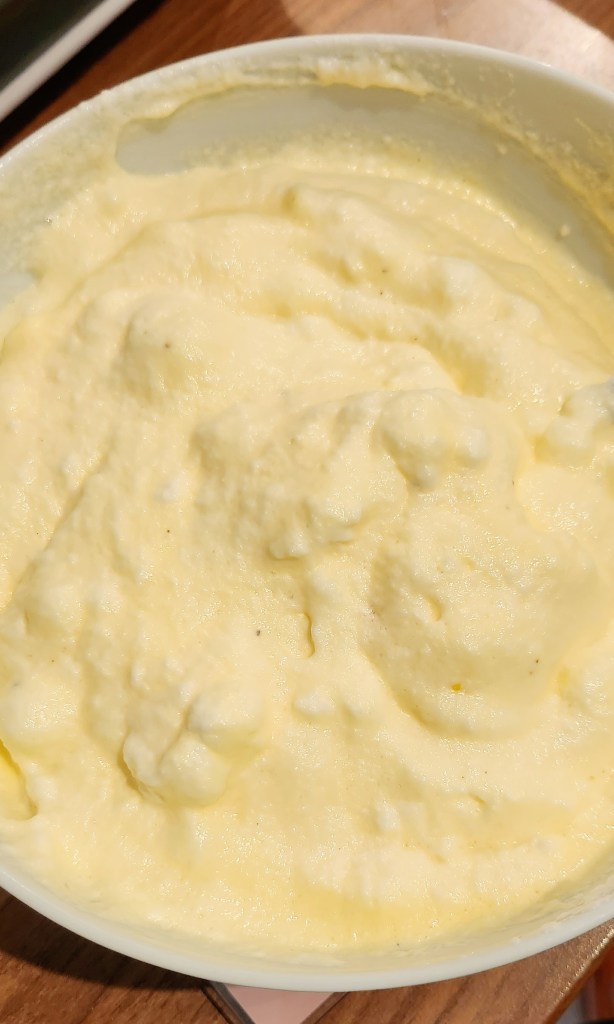 Die Eigelbe mit dem Frischkäse, Backpulver, Pfeffer und Kräuter verrühren. Nun den Eischnee gründlich unter die Eigelbmasse heben.