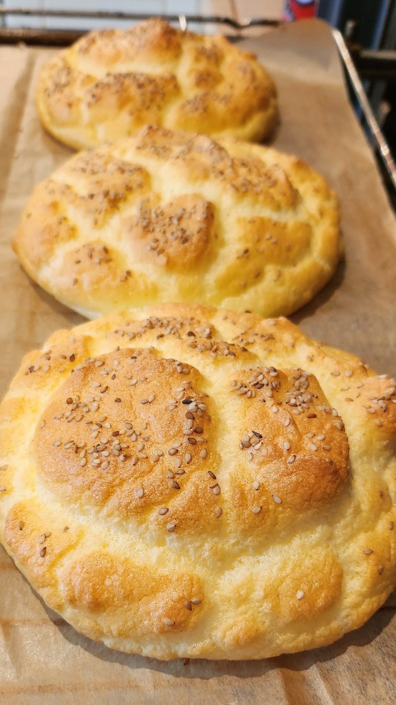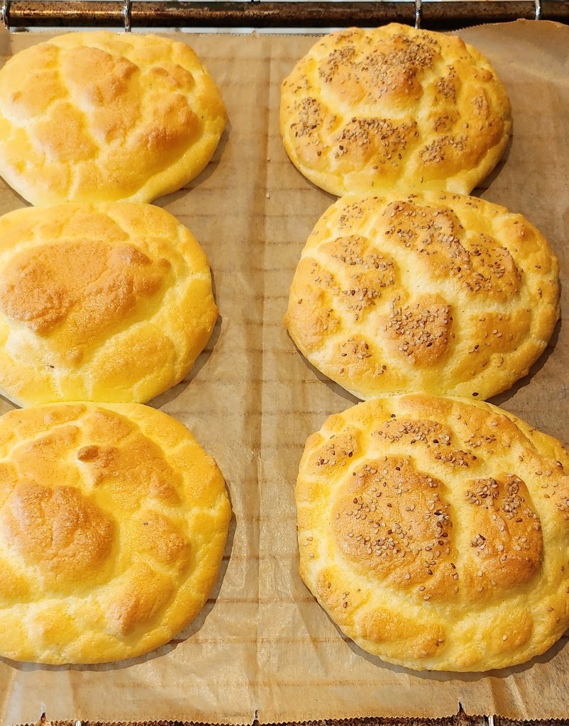 Die Oopsies gehen während dem Backen schön hoch. Aber beim Abkühlen sacken sie wieder etwas zusammen. Vor dem Belegen sollten die Brötchen richtig abgekühlt sein, so lassen sie sich am Besten belegen und essen.