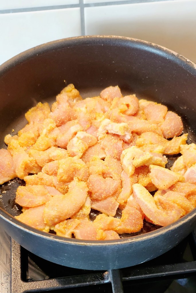 Die Hähnchenbrust in Streifen schneiden und in Polenta wälzen. Öl in einer Pfanne erhitzen und die Hähnchenstreifen scharf anbraten. Mit Salz und Pfeffer würzen.