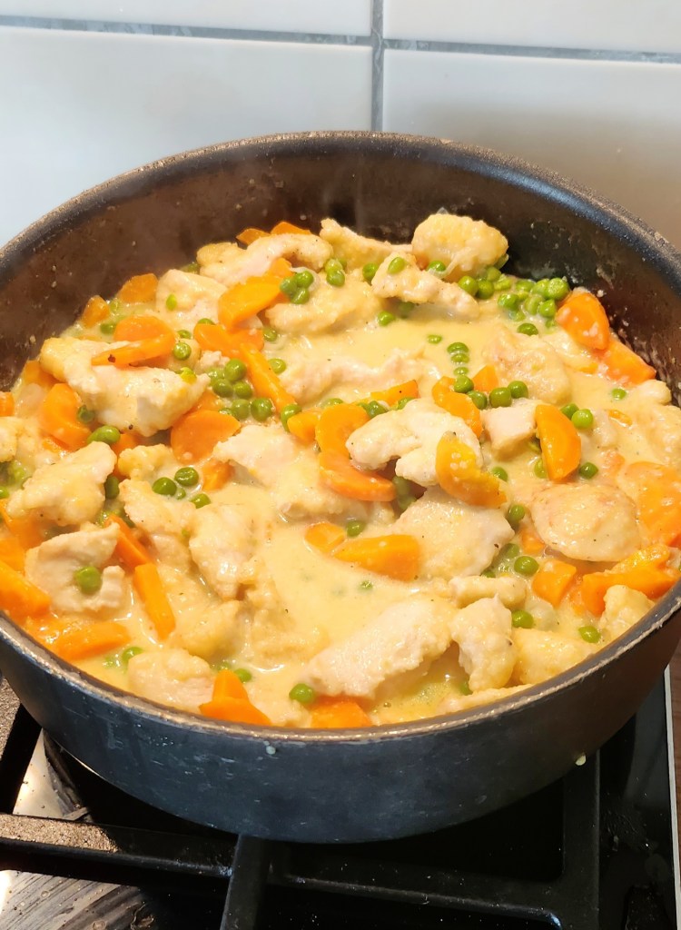 Mit der Gemüsebrühe ablöschen und für ca. 10 Minuten köcheln lassen, bis das Gemüse durch ist. Jetzt Hähnchen und die Sahne hinzugeben und aufkochen.