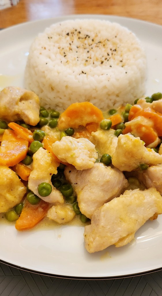 500 g Hähnchenbrust | ca. 5 EL Polenta | 300 g Erbsen | 300 g Möhren |1 Zwiebel | 500 ml Gemüsebrühe | 200 ml Sahne | 240 g Reis | Salz und Pfeffer | 1 EL Butter | neutrales Öl zum Braten