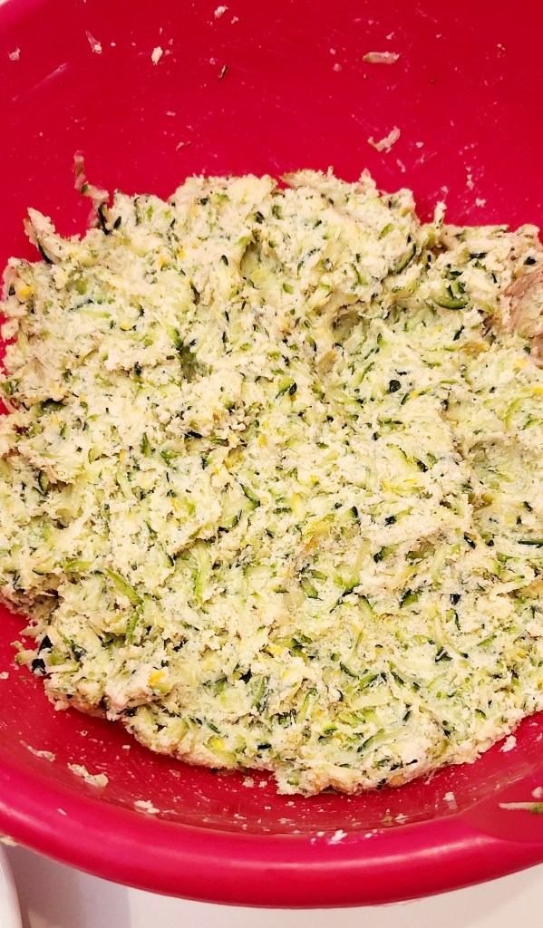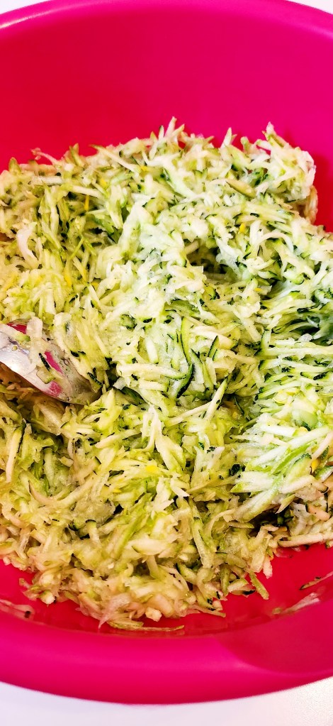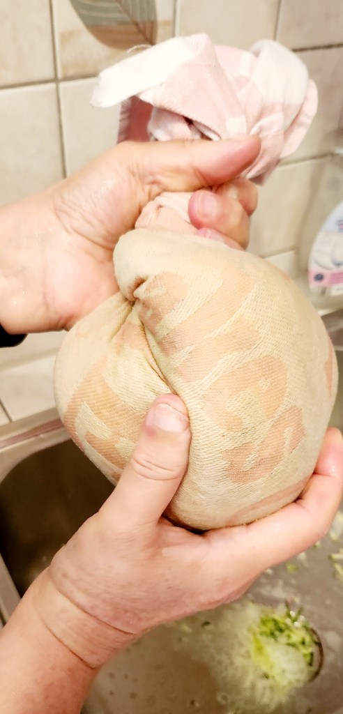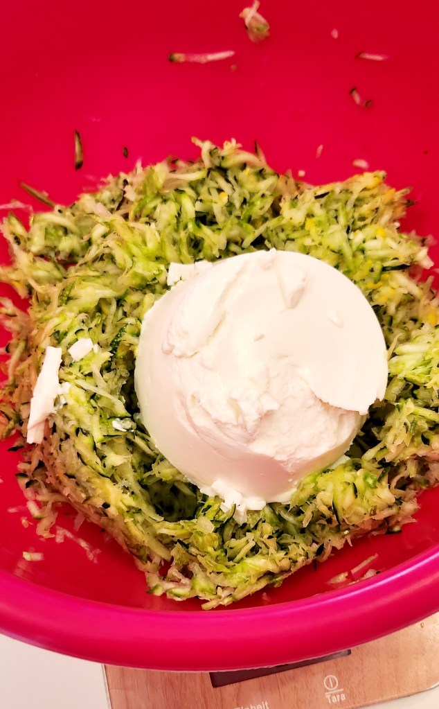 Die Zucchini raspeln und durch ein Küchentuch pressen. Sie sollten so viel Wasser wie möglich verlieren.