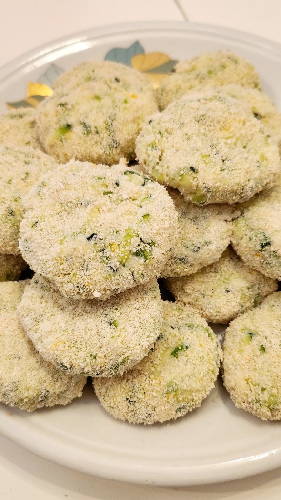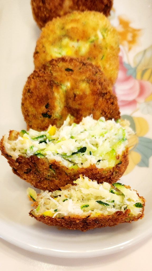 700 g Zucchini | 250 g Ricotta | 1 Knoblauchzehe | 150 g Paniermehl und etwas Paniermehl zum wälzen | Salz und Pfeffer | 70 g Parmigiano | 1 Ei | neutrales Öl zum frittieren/braten | etwas Petersilie und Basilikum |