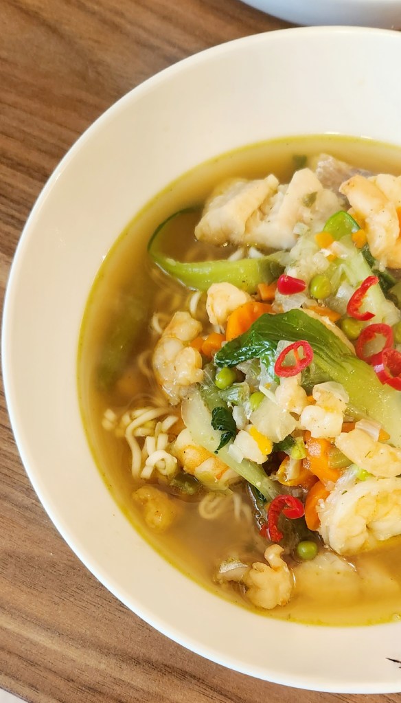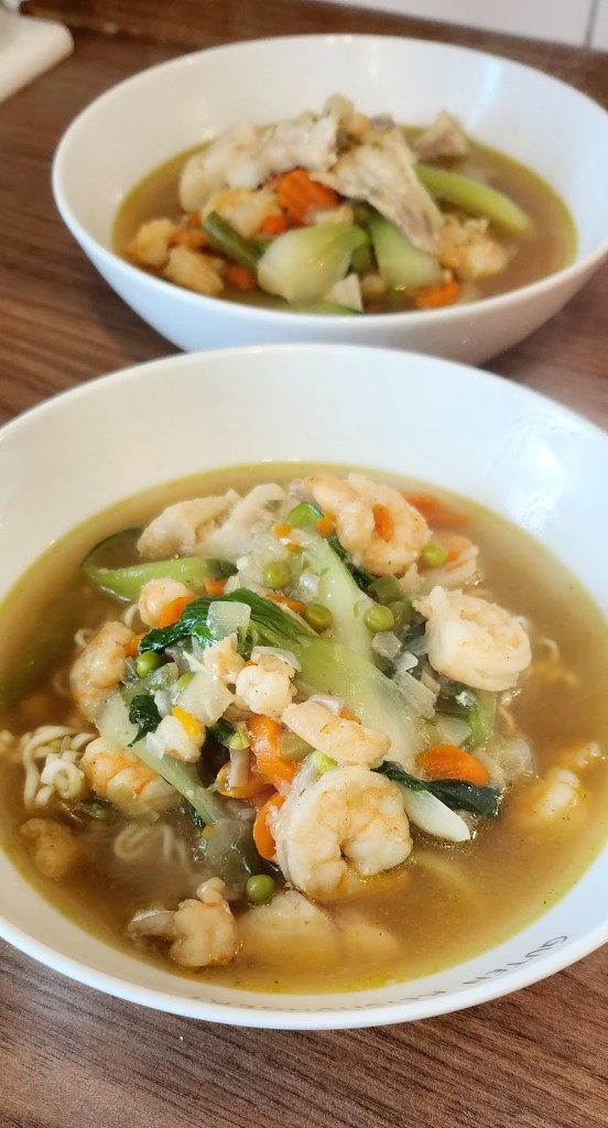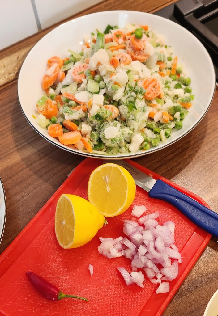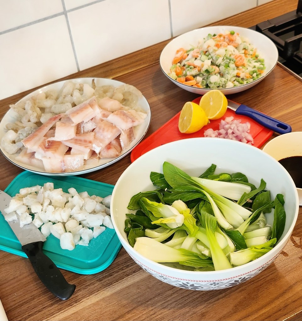 500 g Garnelen| 3 Alaska Seelachsfilet | 2 Pak Choi | 1 Zwiebel | 1 Chili | 1 Zitrone | 4 EL Soja Soße | 1 Teller TK Suppengemüse | 1,5 Liter Gemüsebrühe | 250 g Mie-Nudeln |etwas neutralem Öl für die Pfanne
