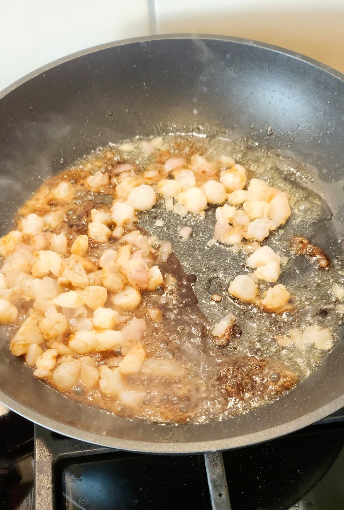 Garnelen und Fisch waschen und gut trocknen. Eine Handvoll Garnelen klein schneiden. Fischfilet in Mundgerechte Stücke schneiden.
