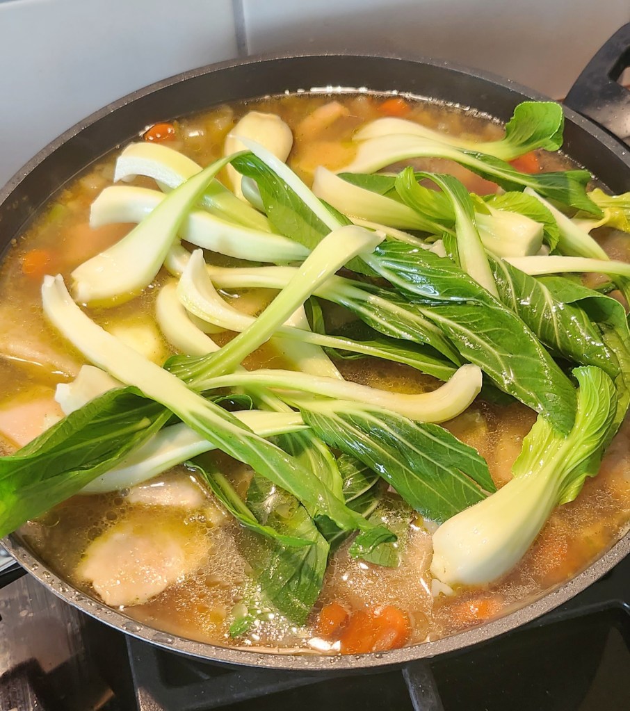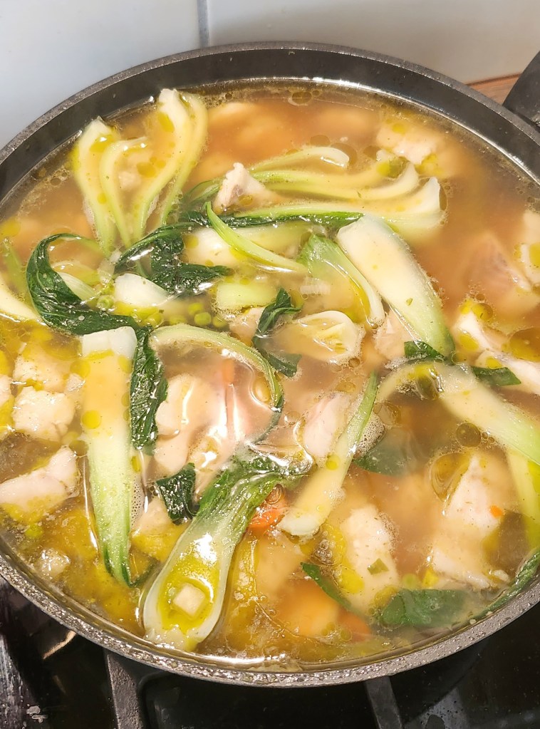 Jetzt die Garnelen, die Fischstücke und den Pak Choi zu der Suppe geben und bei niedrigster Stufe für 10 Minuten ziehen lassen. Zum Schluss mit Sojasoße und Zitronensaft nochmal abschmecken.