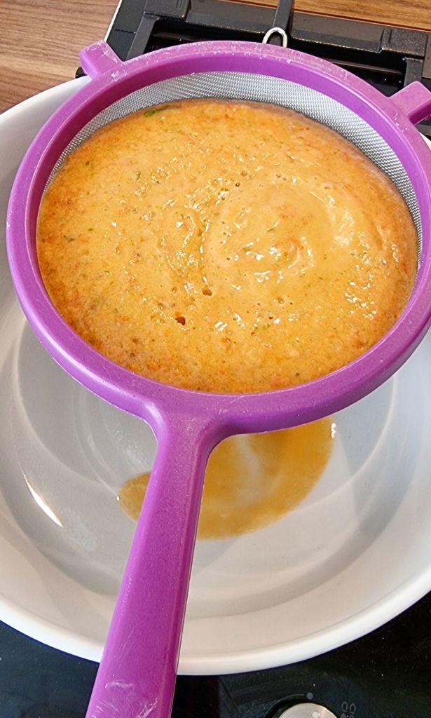 3. Die „Soße“ jetzt durch einen feinen Sieb passieren, damit man die Schale und die Kerne der Tomaten nicht im Salat hat.