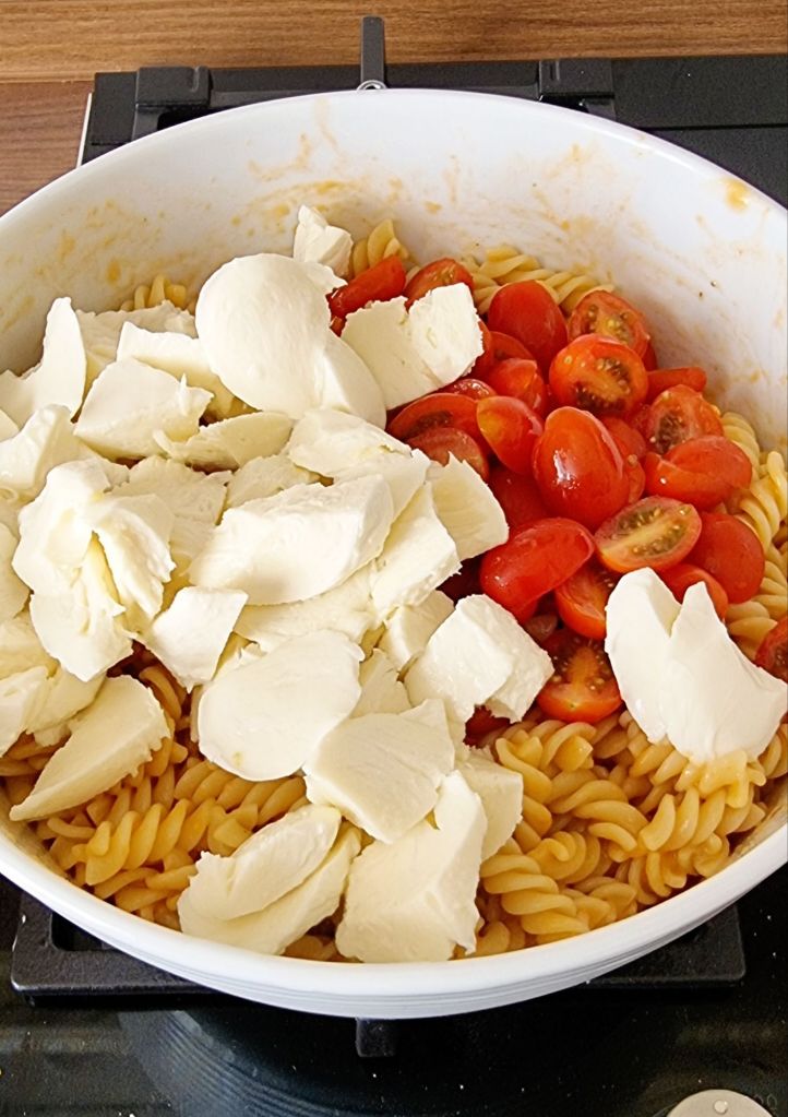 6. Tomaten und Mozzarella zur Pasta geben und durchrühren. Mit Frischehaltefolie abdecken und im Kühlschrank stellen.