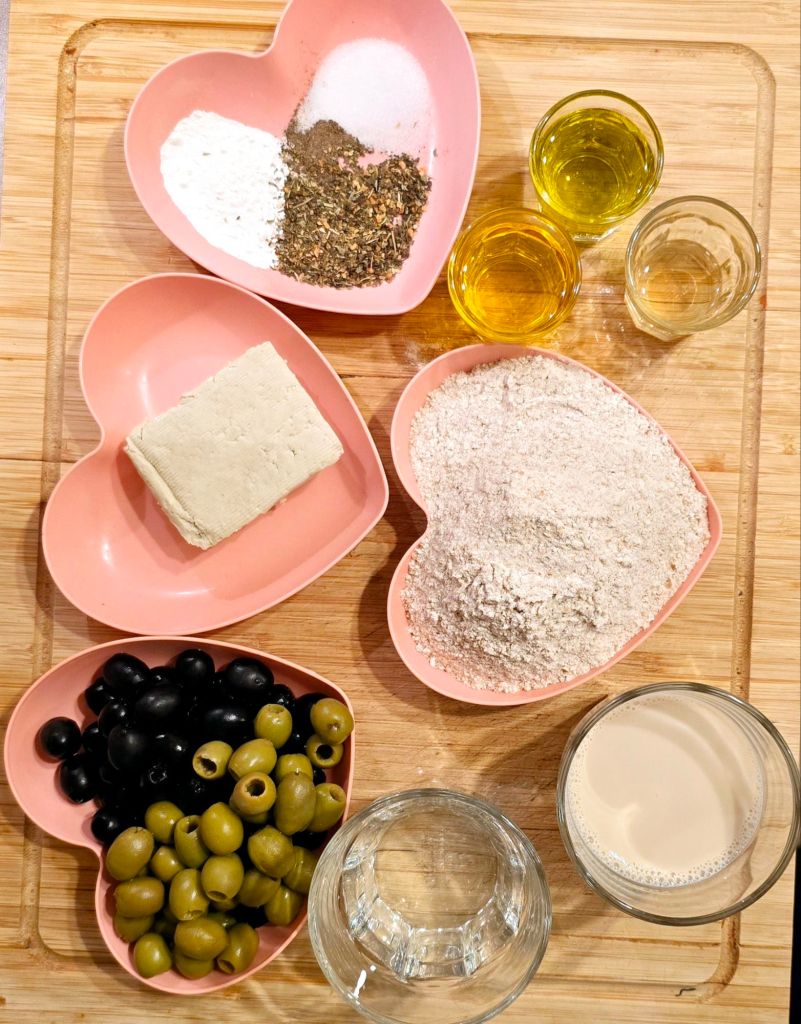 110 g schwarze Oliven (in Wasser) | 80 g grüne Oliven (in Wasser) | 100 g Tofu | 200 g Vollkornmehl | 1 TL Backpulver | 1 TL Natron | 1/2 TL Salz | 1/2 Tl Pfeffer | 1 EL getrocknete Kräuter | 150 ml Hafermilch | 100 ml Sprudelwasser | 30 g Rapsöl | 30 g Olivenöl | 1 EL Apfelessig