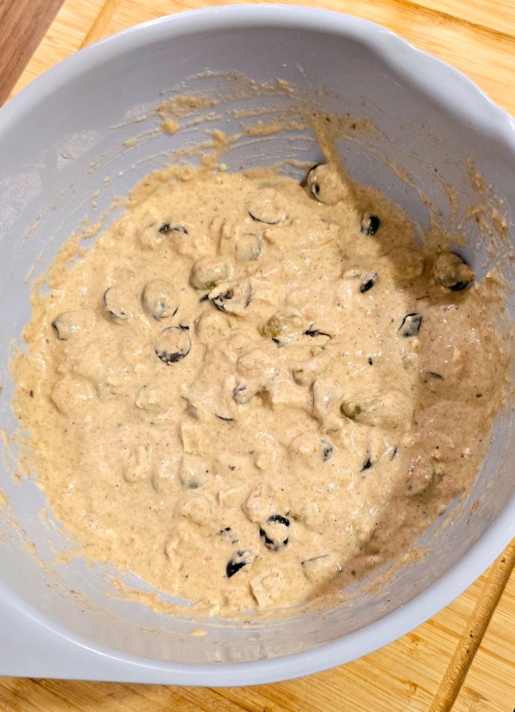 Oliven und Tofu unter dem Teig heben.