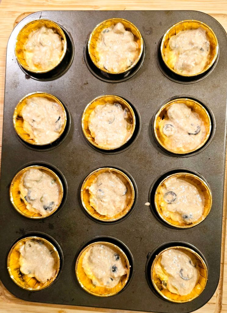 Eine Muffinform mit 12 Förmchen auslegen und je 2 EL Teig in die Förmchen verteilen.