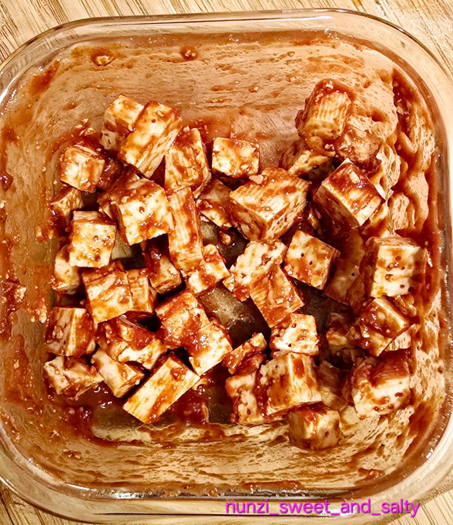 Um eine gute Proteinquelle zu haben, kommt Tofu zum Einsatz, der so mariniert wirklich lecker schmeckt und absolut nicht langweilig ist.