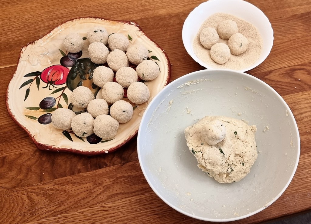 Jetzt etwa 30 kleine Bällchen formen und in Semmelbrösel wälzen