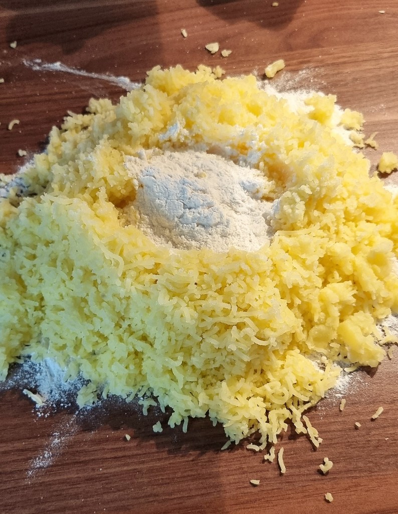 • nun 6 großzügige Esslöffel Weizenmehl, Salz zu den Kartoffeln geben und zu einem Teig verkneten