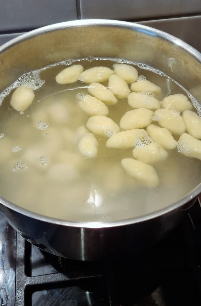• sobald das Wasser kocht die Gnocchi hineingeben und Warten bis sie auf der Wasseroberfläche schwimmen. Jetzt mit einer Schaumschelle die Gnocchi herausnehmen und warten bis die nächsten auf der Oberfläche schwimmen usw.