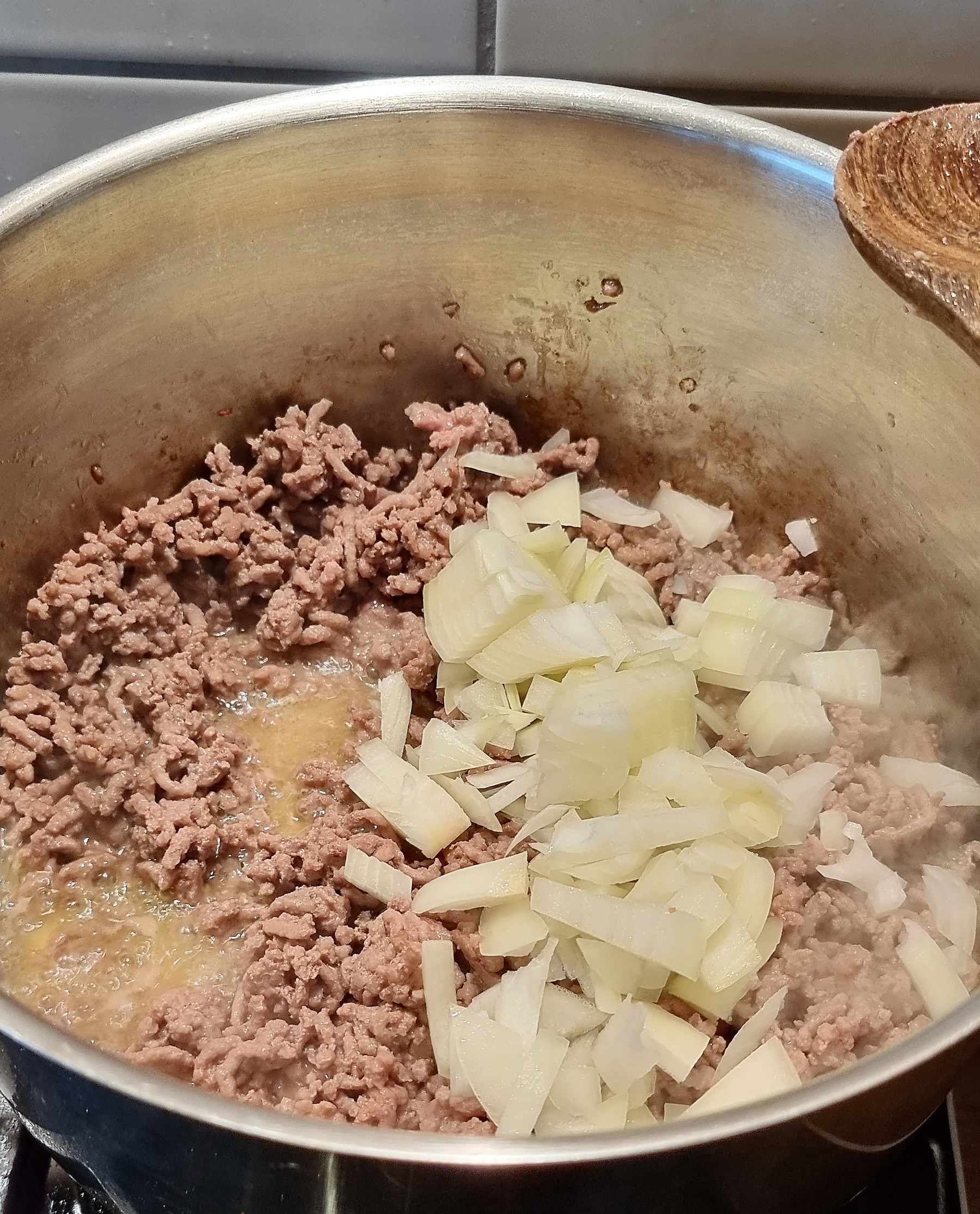 - wenn das Hackfleisch halbwegs angebraten ist, die Zwiebel hinzugeben und fertig garen